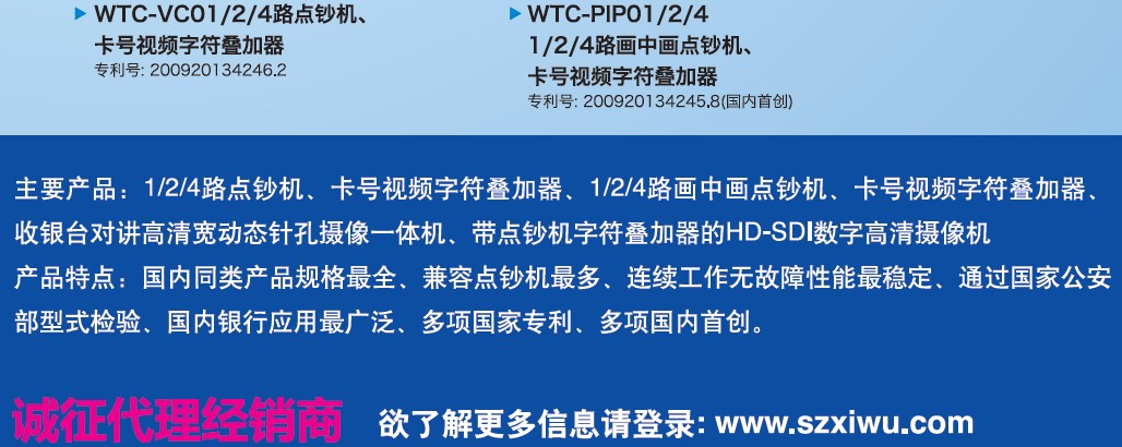 自主研發(fā)產(chǎn)品:點(diǎn)鈔機(jī)視頻字符疊加器、畫(huà)中畫(huà)點(diǎn)鈔機(jī)字符疊加器、銀行卡號(hào)字符疊加器、畫(huà)中畫(huà)銀行卡號(hào)字符疊加器、銀行窗口攝像對(duì)講一體機(jī)系統(tǒng)、針孔攝像對(duì)講機(jī)、700線單板機(jī)、電梯樓層顯示器(電梯樓層字符疊加器)等應(yīng)用于銀行網(wǎng)點(diǎn)及其他繳費(fèi)場(chǎng)所的監(jiān)控設(shè)備!